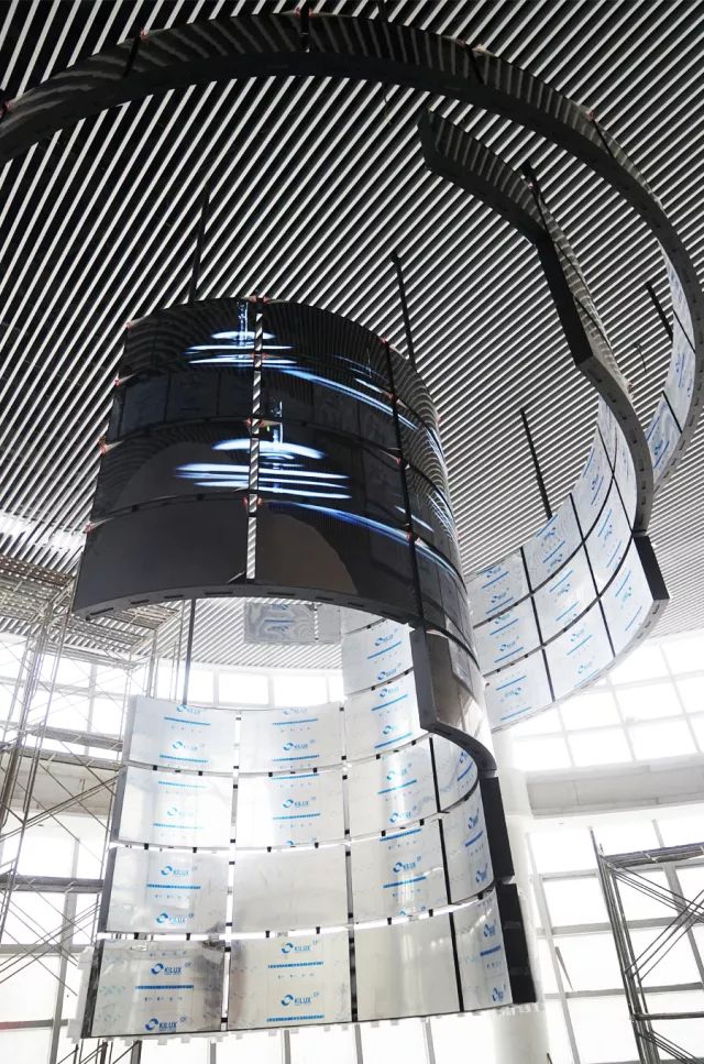 LG 55EF5C是一款開放型的OLED曲面拼接顯示器,利用OLED柔性屏幕的特點,具有向外凸顯和向內(nèi)凹陷的兩種造型,可以滿足客戶更多的創(chuàng)意設(shè)計。華數(shù)產(chǎn)業(yè)園項目正是看中了 LG 55EF5C的這個特點,通過LG打造出一個強大而震撼的信息發(fā)布平臺,在國內(nèi)獨占風(fēng)頭。整個造型分為3層環(huán)形,最大半徑為4.5米,最小半徑為2米,錯落有致的拼裝十層屏幕。而OLED兩層結(jié)構(gòu)的輕薄機身,僅用最低限度的支撐便可懸掛于天花板上,整體造型既輕盈而又充滿了科技感。同時,該項目利用LG特有的webOS系統(tǒng),實現(xiàn)整體拼接屏幕視頻內(nèi)容的同步播放,方便管理的同時有效降低采購成本和運營成本。